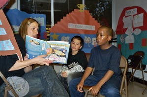 Bookpal Kathy Kupiecki captivates her audience with a spaceship book.