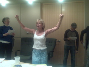 Our amazing ensemble of volunteer actors rehearsed several times to prepare the Reading Assemblies. Pictured are Barbara Mundy, Jon Mindell, and Eric Saiet.