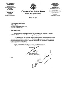 Correspondence from Congressman Tom Price, M.D. Congratulating the Honorable Judge Paul Carden