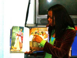 The book is called “Liberty Street”, and it is by Candace Ransom. It takes place during slavery and it’s about a family that works for a lady on her property. They work in the home and on the upkeep of her house. I play the schoolteacher, Ms. Eulalie, who is a freed black. It is illegal to teach slaves to read, I could be jailed for teaching them.