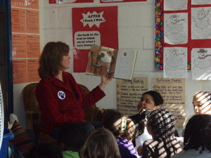 Yvonne Erickson reads to Ms. Baldi's third grade class. The students brought in pillows and stuffed animals for storytime.