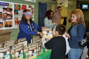 Principal Elizabeth Heffernan hands out copies of MOMMY? to students as they arrive with their families.