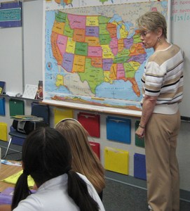 BookPAL, Anita Rufus, locates her hometown on US map for students in 2nd grade classroom.