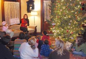 Adena reads Strega Nona in the glow of a Christmas tree at Fillebrown House. (Photo: Paul Dols, PressPubs.com)