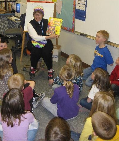 Mary Kay Bodeen is one of our busiest BookPALS in Minnesota! She retired from teaching a few years ago, but that didn't keep her out of the classroom. This winter, Mary Kay has been reading at Braham Area, Coldspring and Cambridge-Isanti schools during I Love to Read Month in February and Read Across America in March. She embellished her reading of Kiki's Hats by wearing wonderful hats knitted by her friend Ione Hurt. In this book by Warren Hanson, Kiki loves to knit hats and give them away, leading many other people to be generous. As Mary Kay says, "Thanks to Ione for the hats. She's a REAL Kiki to me!"
